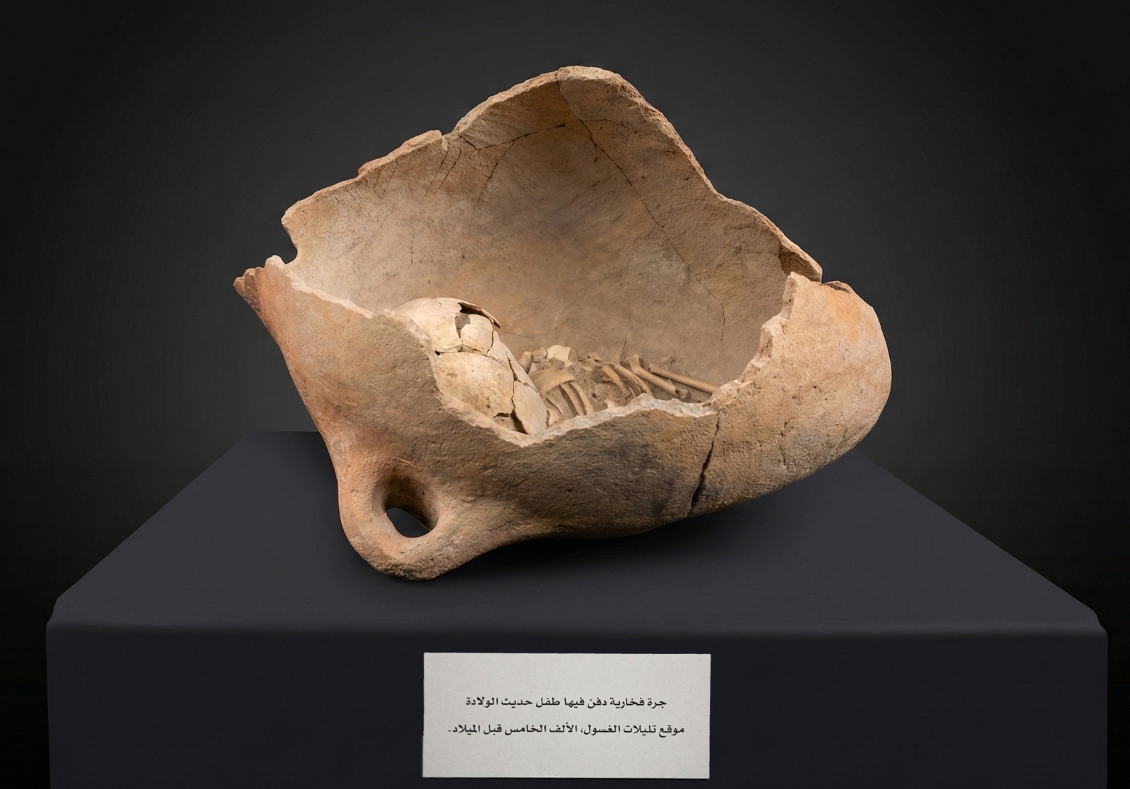 جرة فخارية استخدمت للدفن تحتوي على هيكل عظمي لطفل، حيث عثر في موقع تليلات الغسول - موقع شرق وادي الاردن، بالقرب من أريحا / فلسطين- على الكثير من الهياكل العظمية لأطفال حديثي الولادة دفنت في جرار فخارية تحت أرضيات المنازل. الألف الخامس/ الرابع قبل الميلاد.