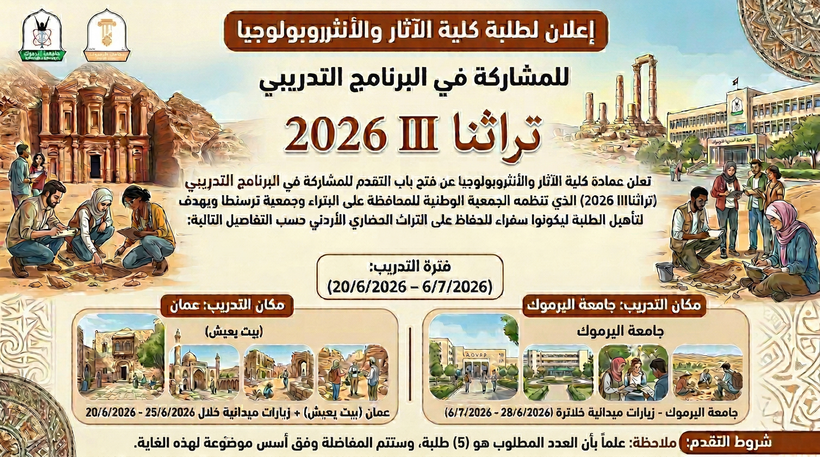 تعلن عمادة كلية الآثار والأنثروبولوجيا عن فتح باب التقدم للمشاركة في البرنامج التدريبي (تراثناⅢ 2026) الذي تنظمه الجمعية الوطنية للمحافظة على البتراء وجمعية ترسنطا ويهدف لتأهيل الطلبة ليكونوا سفراء للحفاظ على التراث الحضاري الأردني حسب التفاصيل التالية:
